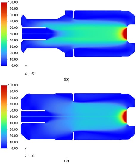 The velocity (m/s) of the gas phase in I pulse combustion chamber at different times: (a) t = 2 s; (b) t = 7 s; (c) t = 14 s.