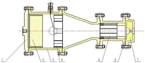 Based on the simulation analysis results in Section 2, the experimental system for ablation of insulation layer was developed to investigate the ablation influence of the gas flow velocity on I pulse insulation layer under II pulse working conditions, as shown in Figure 7. The experimental device is a sub-scale engine with a maximum diameter of 300 mm and a length of 200 mm. Among them, 1 is the front head, 2 is the propellant grain, 3 is the case, 4 is the low-velocity section, 5 is the high-velocity section, 6 is the propellant grain baffle, and 7 is the nozzle. HTPB propellant was used in the experiment and the II pulse working conditions were realized by two artificial ignitions.