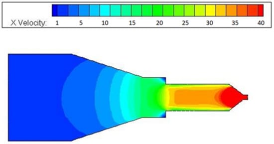 After the PSD of the II pulse engine is destroyed, the channel sizes are different, resulting in inconsistent gas phase velocity in the I pulse combustion chamber. Therefore, the ablation of the I pulse insulation layer is different. The temperature is too high to measure the gas phase velocity inside the sub-scale engine under working conditions, so the gas phase velocity is calculated by numerical simulation to estimate the test velocity. Figure 8 shows the gas phase velocity at different positions of the sub-scale engine. From the velocity contour in Figure 8, the gas phase velocity on I pulse insulation layer varies from 0 to 30 m/s. Therefore, the velocity in the ablation experiment was divided into two types: the low-velocity of 2 m/s and the high-velocity of 30 m/s.