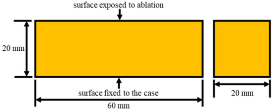 Different experimental conditions are achieved by placing the specimen in the low-velocity section and the high-velocity section of the apparatus. Size and shape of the specimens are shown in Figure 9. The specimen size is much smaller than the sub-scale engine size, and positions for placing the specimen are reserved inside the sub-scale engine. Therefore, the influence of the specimen on the gas phase velocity can be ignored. The material of the specimen is consistent with the material of the insulation layer. Ethylene propylene diene monomer (EPDM) is used as insulation layer because of its low density, high thermal decomposition temperature, and thermal resistance.