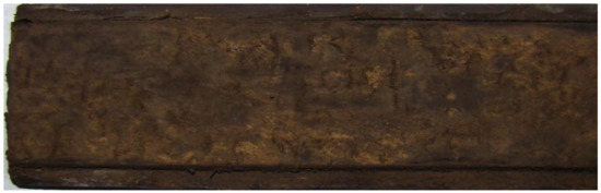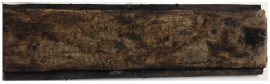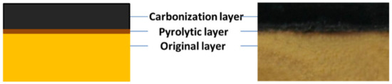 Observing the cross-section of the entire specimen, it was found that the cross-section includes the carbonized layer, the original layer, and the pyrolytic layer in between. The structure is shown in Figure 12, in which the left side is a schematic diagram, and the right side is a physical diagram. In this experiment, the pyrolytic layer was retained when the carbonized layer was peeled off. The surface of the insulation layer was carbonized under the high temperature and high pressure of the fuel gas and formed a carbonized layer. The pyrolytic layer in the middle was protected by the surface carbonized layer and did not reach the temperature required for carbonization. Only the decomposition reaction of the material happened after heating, and it became the pyrolytic layer with darker color than the matrix layer and lighter color than the carbonized layer, which can distinguish the original layer and the carbonized layer.