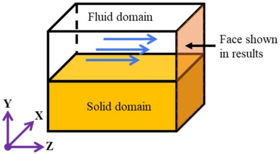 The ablation model is established according to the size of the test piece as shown in Figure 16, where the upper part is the fluid domain, the Z direction is the flow direction, and the lower part is the solid domain. The face on the right side of the model is displayed in Figure 17 and Figure 18. The working conditions are consistent with experiments. The working pressure of the combustion chamber is 7.0 MPa and the working time is 5 s. The time interval between two pulse ignitions is 50 s. The gas velocity in the fluid domain is changed to simulate the low gas phase velocity (2 m/s) condition and high gas phase velocity (30 m/s) condition. After the I pulse, the carbonized layer under high gas phase velocity condition is peeled off.