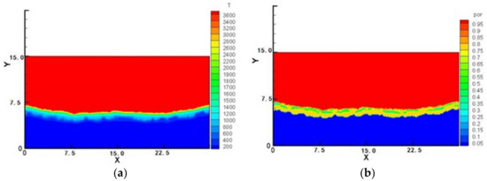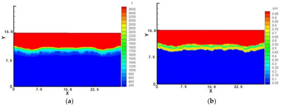 Numerical calculation results under the gas phase velocity of 2 m/s: (a) the temperature (℃) distribution contour; (b) porosity distribution contour.