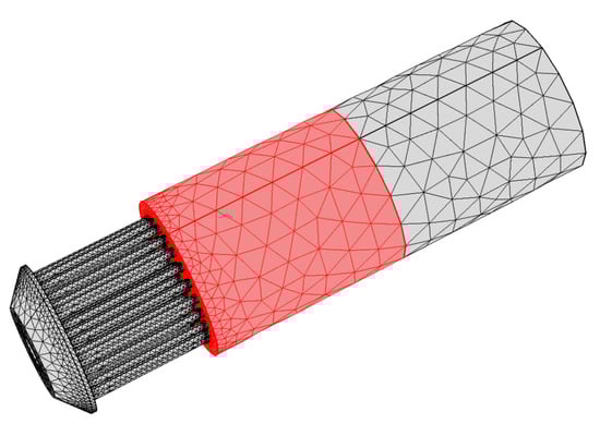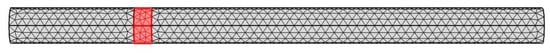 Following previous research [], the proposed models and solver have been firstly applied to the simplest geometry—Rijke tube model combustor, as shown in Figure 1. The length of the tube is 3 m and the radius of the tube is 0.1 m. Both ends of the tube considered open to the atmosphere, i.e., . The flame is placed at one quarter of the tube (as represented by the red block in Figure 1), and has a width of 0.02 m. The mean temperature before and after the flame are K and K, respectively. The flow in the two sections is assumed as air, and the thermal properties of air are used in the calculation. The specific ratio is assumed constant and equals . Figure 1 also shows the mesh for the simulation.