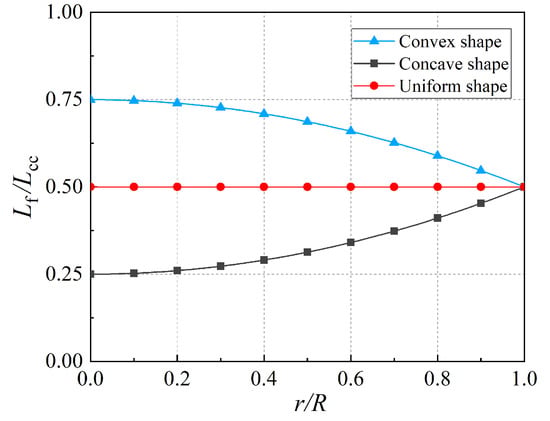 where and represent the flame lengths as a function of radius r for the convex and concave shapes, respectively. represents the length of the entire combustion chamber. equals 1.58 herein, a and b equal 5.7737 and 1.1934, respectively. The difference between the flame length at the center and that near the lateral wall is 0.05 m. The uniform flame in the BKD combustor is considered half of the length of the combustion chamber, as shown in Figure 2. The flame length distribution for the three types of envisaged flames are shown as Figure 5. The variables are nondimensionalized to describe the shape of the heat resource. The effect of flame length distribution on the nonlinear CI will be described in details in Section 4.3.
