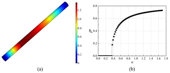 The fundamental frequency of pressure perturbation in the Rijke tube is 74 Hz when there is no heat source (i.e., ). This mode shape is presented in Figure 6a, with low pressure oscillation amplitudes near two ends and high amplitudes in the middle. The bifurcation diagram shown in Figure 6b is plotted under the condition that the time delay of the FDF is 7 ms, and a supercritical bifurcation presents. These results qualitatively match those results shown in [], validating the methodology used in this paper. The value of n is increased by a step of 0.003. When , the thermoacoustic system remains stable, and . thus is considered as the Hopf point. When n exceeds 0.2933, the envisaged acoustic mode becomes unstable, and a limit cycle is established when . It is noted that increases monotonously. Furthermore, the limit cycle value increases rapidly when n is close to the Hopf point, and then the increased speed decreases with increasing n.