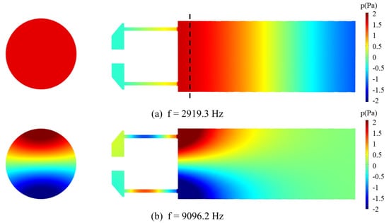 In this work, one firstly considers the situation that the flame length distribution along the radius is uniform. The frequencies of the first longitudinal and first transverse thermoacoustic modes equal 2919.3 Hz and 9096.2 Hz respectively, and their mode shapes can be viewed in Figure 7a,b. The frequency of the first transverse mode 9096.2 Hz is similar to that of experiment 10,260 Hz [], the offset may be because of physical parameter error from RANS. It is noted that the pressure perturbations in the oxygen injection unit are both smaller than those in the combustion chamber for the two modes. For the first transverse mode, a maximum pressure perturbation is attained near the injection plate. Under these conditions, the combustor is more prone to combustion instabilities. For the first longitudinal mode, the combustion instability in the combustor behaves more like that in the Rijke tube. Furthermore, the transverse combustion instabilities are more prone to occur in the LRE combustor and are more harmful. One thus pays more attention to the first transverse mode.
