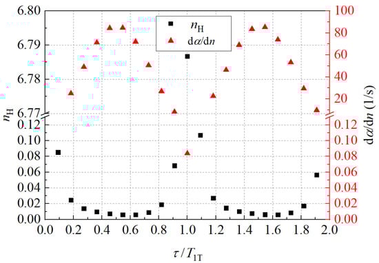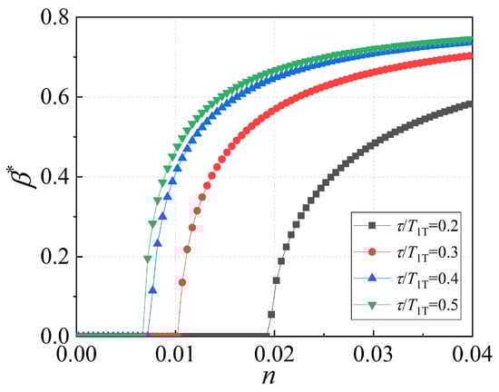 One firstly considers the linear stabilities of the first transverse mode, i.e., only the linear part of the FDF is considered and in Equation (4). For the sake of simplicity, one defines a time period , where Hz. It is then possible to normalise the time delay of the FDF by this time period, as it is typically found that the modal frequency and growth rate change periodically and the period typically approximately equals the inverse of the modal frequency [,,]. Figure 8 shows the linear results of the first transverse mode for different time delays . For a small time delay = 0.1, the first transverse mode remains stable and the growth rate when . With increasing n, the growth rate increases and equals 0 when . One considers as the index value for the marginal stable situation. When n is further increased, this mode becomes unstable, and the nonlinear term should be considered. It is then possible to increase the time delay , and results show that the trajectory of also features a periodic motion. reaches the maximum value of 6.787 when and has the minimum value of 0.005 when . It should be noted that the mode is more stable for a larger value of , i.e., the first transverse mode is more stable when approaches 1 and more unstable when approaches 0.5. It is also interesting to note that, when , a small change of the time delay may lead to a large change of , indicating that the stability of the first transverse mode is more sensitive to when and is more inert when when . It is also possible to examine the change rate of the growth rate with n when . The trajectory of this value with is also shown in Figure 8. When , the value of reaches the maximum value of 85 s−1, indicting that the stability is more sensitive to n. When , has the minimum value, and the modal stability is less sensitive to n.