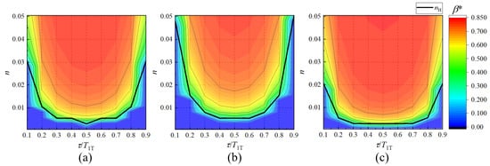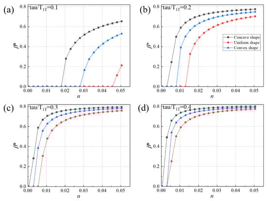 In order to quantitatively compare the differences among results for the three flame length distributions, plots under different are extracted and shown in Figure 11. Due to the quasi-symmetric shape of the contour as a function of n (Figure 10), only results for half part are presented. Results show that the first transverse mode is more unstable for non-uniform flame length distributions. For example, when equals 0.1, the first transverse mode of the BKD combustor with concave and convex shapes enter the limit cycle when equals 0.018 and 0.028, and the value of is 0.0455 for the uniform distribution. Furthermore, the limit cycle value increases with increasing and attains the maximum value when is close to 0.5. This also agrees with the periodic motion as illustrated in Figure 8. Further, the concave, convex and uniform flame length distributions represent different flow rate distributions. Once the law was commanded, combustion instability could be attempted to eliminate by designing flow rate distribution. Therefore, the simulation of this paper suggested that a uniform flame shape may be a good way to control combustion instability.