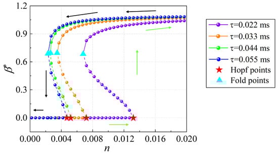 One now considers the nonlinear behaviours of the first transverse mode by accounting for the full expression of the FDF (Equation (4)). Figure 9 shows the bifurcation diagrams of the first transverse mode of the BKD combustor for different time delays . One firstly takes the diagram when to illustrate the bifurcation. When n is smaller than the value of Hopf point , the mode is stable. With increasing the value of n, the mode becomes more unstable. When n exceeds , the mode becomes unstable, and a limit cycle is established when , where the growth rate again equals 0 and a limit cycle is established. It is noted that the value arises with increasing n. Similar to that for the Rijke tube, a supercritical bifurcation also presents. When changes, the change in the shape of the bifurcation diagram remains small while the location changes. Since the calculation is quasi-symmetric with the symmetric axis , a period motion of the entire diagram with is also observed, which agrees with the linear analysis. It is further noted that, when is close to 0 or 1, the Hopf point is larger and the value of is smaller. When is close to 0.5, the Hopf point is smaller and the increases more rapidly when n is close to , which agrees with the results for in Figure 8.
