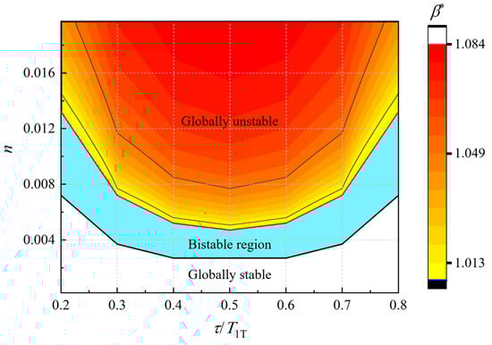 The region of stability analysis for the variation of flame describing function gain index n and the time delay is shown in Figure 13. The black solid line and the red solid line indicate the fold points and the Hopf points, respectively. Between them, different regions represent the different stable states. Similar to the contour of the pressure perturbation amplitude in the previous section, the lower part of Figure 13 is a globally stable region independent of the pressure perturbation amplitude. Similarly, the upper part is a globally unstable region independent of the pressure perturbation amplitude. Between them, a region that is neither globally stable nor globally unstable emerged, which considered as the bistable region. A stable steady state and a pair of stable and unstable limit cycles are included in this region. The converged state is determined by the initial pressure disturbance.