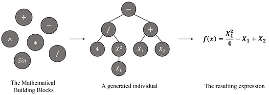 Fitting suitable trend lines and creating statistical models under uncertainty can be challenging. However, optimization can be used for this purpose. One way of doing so is to use symbolic regression. This, as the name implies, is a regression analysis that yields prediction models using mathematical expressions that best fit a given dataset. Lengthy mathematical expressions are typically penalized so that both accuracy and simplicity are considered [21]. Optimizations using, for example, genetic algorithms are thus suitable because the mathematical building blocks—such as addition, subtraction, and multiplication—can be seen as the different available chromosomes. An optimization is then performed with the objective of minimizing aspects such as the mean square error, while penalizing the complexity of the resulting expressions or individuals. This reduces some of the human bias and creates a “simple” but accurate prediction model from statistical data using optimizations. The end result of a symbolic regression using genetic algorithms is therefore an equation, or formula, optimized to fit the given data while keeping the expression simple in terms of length and complexity. Figure 2 provides an example of a symbolic regression process.