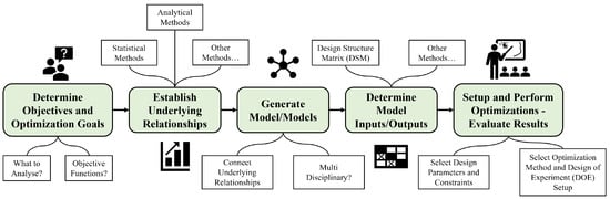 Once appropriate models have been created, the inputs and outputs between each model must be determined. In an MDO case, a design structure matrix (DSM) can aid in this specific task [29]. A DSM gives an overview of the connections between the different involved models and can be used, among other things, to sort the execution order of these models in the subsequent optimization. Finally, appropriate design parameters and constraints can be added to the optimization, depending on the previously determined objectives and goals. Once this is complete, the optimization itself can be set up by choosing a desired optimization method and, for example, sampling the design space using a DOE. The optimization results can subsequently be investigated and evaluated, as well as being used to aid in decision support, design, and trade space explorations. The proposed workflow presented in Figure 3 can be somewhat iterative, and certain steps might need to be revisited throughout the process as more knowledge about a design is generated. However, the final outcome of the workflow is an optimal design point or a Pareto front of overall optimal solutions for the given objectives.