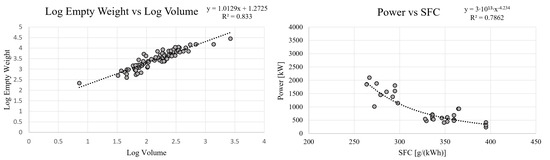 A regression for the relationship between helicopter volume and empty weight on a logarithmic scale (left). The relationship between specific fuel consumption (SFC) and power (right).