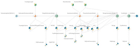 The three design parameters in Figure 5 were specified with range properties to indicate the allowed interval of values. The fuselage, or helicopter, length was defined as being able to vary between 4 and 40 m. Similarly, the rotor diameter was allowed to vary between 4 and 25 m. Finally, the number of rotors was defined as either one or two, corresponding to a single- or dual-rotor configuration. The model execution order follows the structure from Table 2 and Table 3, since no “feedback” loops were detected between the models in the DSM. As mentioned previously, additional constraints were added to prevent the fuel weight and lift to drag ratio from taking on too small or negative values. The originally intended velocity constraint was specified as an upper limit of 350 km/h. The objectives of the optimization were finally specified according to the list at the beginning of Section 4. This is also seen in Figure 5, where a minimization is indicated with a downward-pointing arrow, while a maximization is represented by an upward-pointing arrow.