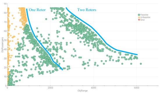 A scatter graph for the number of passengers against the helicopter range. Two Pareto fronts for the number of rotors are identified and marked in blue.
