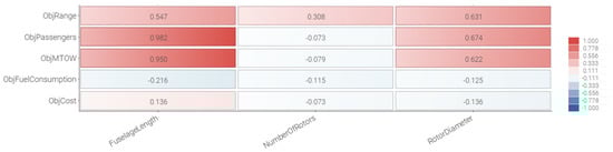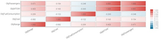 Naturally, the correlation matrix in Figure 8 becomes symmetrical and illustrates both relationships and possible design conflicts between the used objectives. Here, a value of 1 indicates that two objectives are completely in line and that an increase in one of them would yield a similar response in the other. Negative values in the matrix indicate that the objectives are pulling in opposite directions. Values close to zero indicate weak correlations between objectives, while a value of zero would correspond to no correlation at all. For example, the MTOW objective in Figure 8 has a strong positive correlation to the amount of passengers. Cost and range are also positively correlated and would consequently rise with increased MTOW. However, the fuel consumption objective has a slight negative correlation and would therefore decrease as MTOW increases.