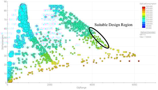 Each line in Figure 9 represents one specific design. It can also be seen here that the fuselage length, number of passengers, and MTOW more or less follow each other (as also indicated in Figure 7 and Figure 8). Consequently, the MTOW objective can be regarded as closely coupled to the number of passengers, thus “reducing” the overall number of objectives to four. As a result, a four-dimensional bubble chart is finally presented in order to identify the most suitable solutions to this specific SAR case study. This bubble chart can be seen in Figure 10.