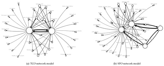 The developed TCO model and SPO model describe the relations (including interactions between actors, operations performed by actors on objects, and feed back from objects to actors) between various agents (actors and objects related to operations) in the current and future aviation systems, respectively, and these agents and relations can be transformed into nodes and edges in the network to develop two weighted directed network models as shown in Figure 4, where the weights represent the frequency of connections. This paper used the open-source software the Social Network Visualizer (SocNetV) Version 3.0.4 to measure network-level and node-level parameters of the two networks separately to evaluate the impact of the transition from the current TCO to the future SPO. The network-level metrics are shown in Table 3. The first three indexes, Nodes, Edges and Interactions, are an overall description of the network. Since SPO adds two automation agents (Nodes = 36, Nodes = 34), the number of edges and interactions between nodes increases accordingly (Edges = 60, Edges = 53; Interactions = 369, Interactions = 297). The last three indexes are obtained based on the first three indexes, and the density and reciprocity indexes of SPO are higher than those of TCO (Density = 0.0476, Density = 0.0472; Reciprocity = 0.13, Reciprocity = 0.08), indicating that the SPO network is more resilient than TCO, and the SPO system is more stable and can cope with more emergencies, further also indicating that the system performance of SPO is better than that of TCO.