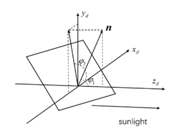 In Section 2.1, the solar sail body coordinate system is defined. The solar sail attitude angle is defined, as shown in Figure 3. According to the geometric relations, the normal direction of the sail could be expressed in as . Therefore, the expression for the solar pressure is as follows: