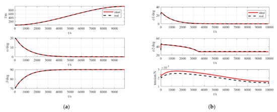 According to the simulation results, the two attitude angle-variation strategies of the dumbbell model and the beads model in the deployment process are almost the same; however, for the variation strategy of length, there is a certain difference between the two models, which might be caused by the elasticity and flexibility of the tether considered in the beads model. Model predictive control (MPC) is used to deal with this problem. Considering the state trajectory of the dumbbell model as the reference trajectory, the results obtained are shown in Figure 8b.