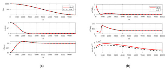 The variation of states is shown in Figure 6a. It can be noticed that the deployment process is completely stable. The length of the tether reaches the target value in about 10,000 s and the two attitude angles reach the target values in about 6000 s. The variation in control input is as shown in Figure 6b. The tension of the tether is always positive, which satisfies the requirement that the tether can only be stretched and not stressed, and the satellite-sail system is successfully deployed.