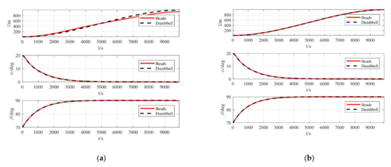 The control law of deployment designed in 4.2 is directly applied to the beads model and the number of beads is selected. The results are compared with the dumbbell model, which considers the mass of the tether in Figure 8a.