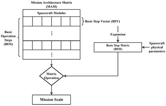 Since the manned Mars exploration vehicle system is very complex, it is necessary to conduct a modular mission scale analysis. The Mission Architecture Matrix (MAM) method is a modular mission analysis method based on a series of studies of baseline mission design of human deep space exploration [,,,,]. This method transforms the mission flow into Basic Operation Steps (BOS) according to the baseline design. Each BOS corresponds to a Basic State Vector (BSV) composed of the state values of all modules of the system. The Basic Step Matrix (BSM) can then be constructed based on the corresponding BOS with BSV and related velocity increment, specific impulse, and other mission parameters. The BSM is actually the parameter transfer matrix of the system, connecting the mission parameters (such as mass, reliability, etc.) before and after one BOS. The parameter transition matrix at any two moments can be obtained by matrix operation of all BSMs between the two moments. Therefore, this method can concisely and intuitively describe the state of the system at all moments, including the initial and the final moment. The fuel consumption can also be obtained from the matrix relationship between the initial and final states. The schematic diagram of the MAM method is shown in Figure 1.