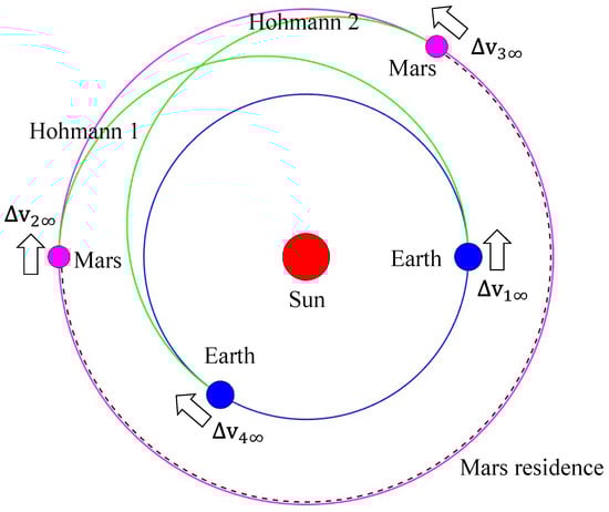 Through the Hohmann transfer method, the velocity increments ∼ in the heliocentric coordinate system could be calculated referring to the work of Howard D. Curtis [].