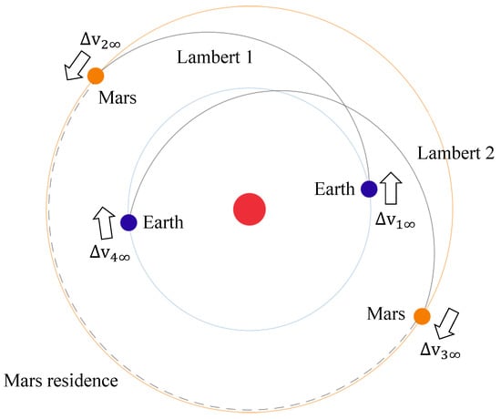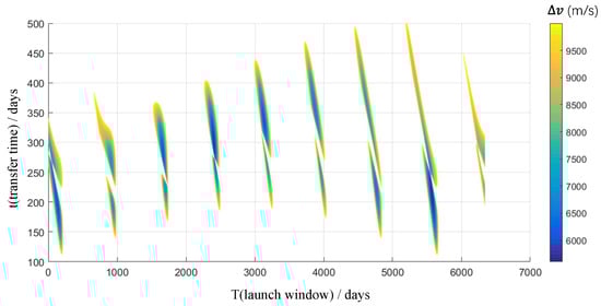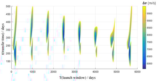 Since the whole mission includes two Lambert transfers (Figure 4), it is necessary to calculate the velocity increments required for a series of Earth–Mars and Mars–Earth transfer orbits during 2035–2050, respectively, by providing the positions of Earth and Mars as well as the transfer times, and then selecting the appropriate launch window and return window according to the time constraints (mission time days). Figure 5 shows the Lambert transfer velocity increment from Earth to Mars from 2035 to 2050, and Figure 6 shows the Lambert transfer velocity increment from Mars to earth from 2035 to 2050. The calculation method of Lambert transfer refers to the work of Vallado [].