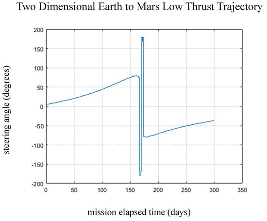 Steering angle (deg) for the mission profile in Figure 7. The horizontal axis is transfer time (in days).