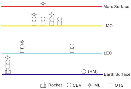 In addition, Taraba et al. proposed a manned Mars exploration scheme based on the LMO space station and preliminarily estimated the mass scale and cost of the manned Mars exploration missions []. Salotti et al. first proposed a manned Mars exploration scheme that divides the return spacecraft into two parts, which can complete the mission requirements when carrying only three astronauts []. In another study of Salotti et al., a new roadmap for the preparation of the human mission to Mars based on the work of ISECG is proposed []. He also proposes using two Mars rovers to carry two astronauts to explore the surface of Mars []. Colombi et al. proposed a radiation environment warning system for manned Mars exploration missions, which can effectively ensure the safety of astronauts [].