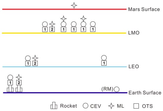 - Simmons, W.; Koo, B.; Crawley, E. Architecture generation for Moon-Mars exploration using an executable meta-language. In Space 2005; American Institute of Aeronautics and Astronautics: Commonwealth of Virginia, USA, 2005; p. 6726. [Google Scholar]