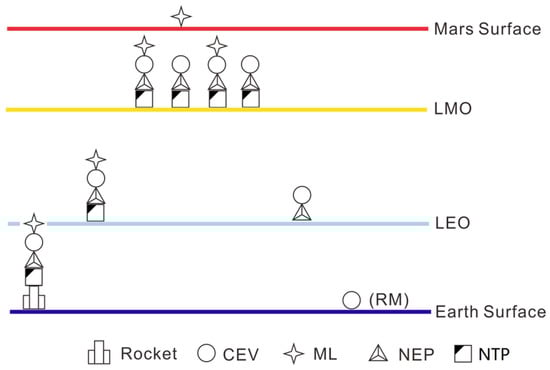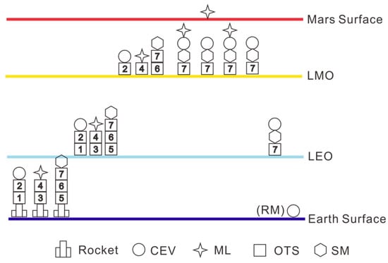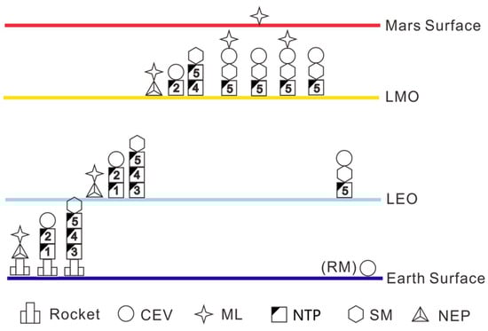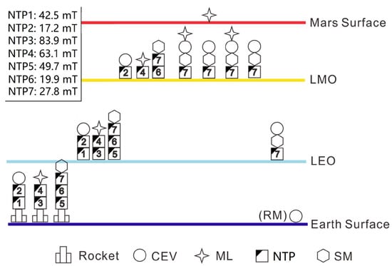 This method has been detailed, introduced, and successfully used for manned Lunar/ near-Earth asteroid mission analysis in our previous work [,]. This paper presents several mission architectures of manned Mars missions and then uses the MAM method to analyze the corresponding mission scale in Section 4. Both chemical engines and nuclear propulsion engines (NTP and NEP) will be included.