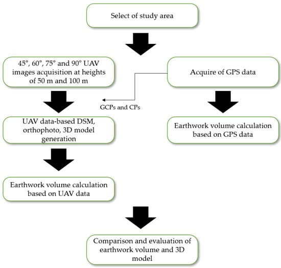 As shown in Figure 1, we evaluated the earthwork volume and 3D model by selecting the research site, acquiring UAV data at various angles, and using global positioning system (GPS) data.