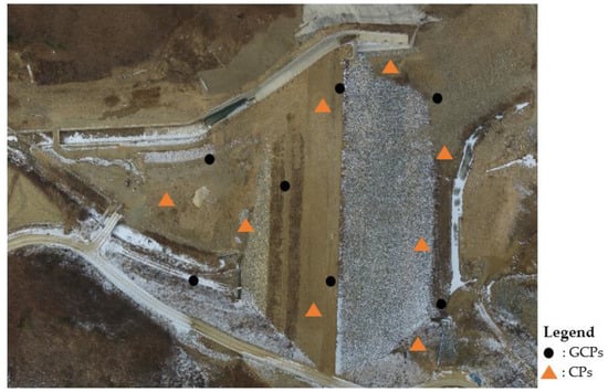 For the GPS data, the earthwork amount for the embankment in the target area was unknown; hence, a large quantity of coordinate data was acquired for use as reference data (to perform the accurate evaluation). GPS coordinate data were acquired after calibration using a virtual base station according to the shape of the terrain. The obtained longitudinal and latitudinal coordinates were converted into plane rectangular X and Y coordinates. The KNGeoid14 model, which is a Korean national geoid model provided by the National Geographic Information Institute (NGII), was applied to calculate the orthometric height. A ground control point (GCP) is a reference point used to obtain a conversion equation between the image coordinates and map coordinates and is utilized to acquire precise 3D coordinates. The GCPs and checkpoints (CPs) were measured using an air photo signal and identifiable corner points. Because it is a small area (0.02 km2), seven GCPs and eight CPs were surveyed, making a total of fifteen points (Figure 2). In Korea, the GCP number is stipulated in principle to be more than 9 points per square kilometer in the regulations for UAV surveying regulation no. 2020-5670, as established by the NGII of the Republic of Korea. In a study with a similar area to this study, the number of GCPs was less than 10 [15,37,38]. Approximately 260 data points were acquired as GPS coordinate data for the earthwork volume calculation. The GPS coordinate acquisition for earthwork volume calculation was measured every 2–3 m in areas with large elevation differences, and every 5–10 m in areas with low elevation differences. The 260 GPS coordinates were used to calculate the earthwork volume and evaluate the 3D model accuracy. This metric was evaluated using 60 random points from 260 GPS coordinates. L1C/A, L1C, L2C, L2E, and L5 signals from 10 to 15 GPS satellites were acquired during the survey. The average horizontal accuracy was 0.009 m, whereas the vertical accuracy was 0.017 m. The position dilution of the precision values was six or less and complied with the network RTK surveying regulation no. 2019-153 in the Public Surveying Work Regulations, as established by the NGII of the Republic of Korea (Table 3).