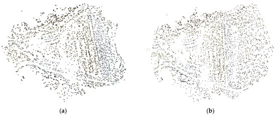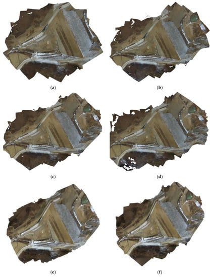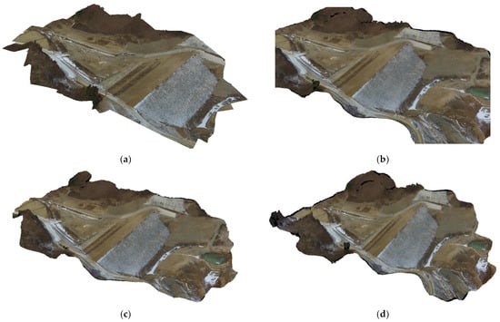 The 3D model of high-density points was performed using the built-tiled model function of the Metashape software [47], which was obtained using a SfM-based method. The SfM technique is suitable for a 3D model because it is possible to construct accurate data for regular topography as well as topography with abrupt changes [57]. The results of the 3D model are shown in Figure 6.