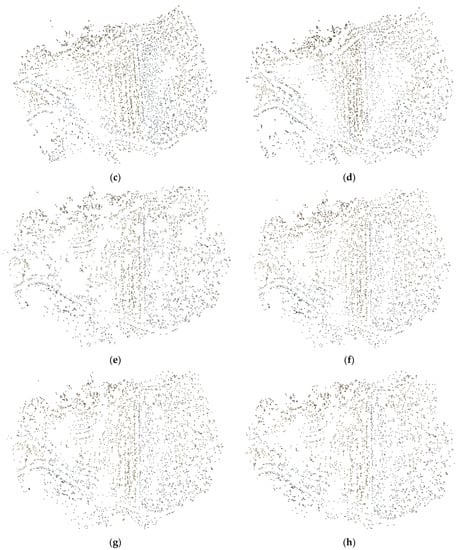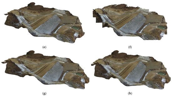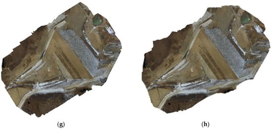 Orthophotos obtained using mesh construction and texturing with data acquired by the UAV: (a) case 1, (b) case 2, (c) case 3, (d) case 4, (e) case 5, (f) case 6, (g) case 7, and (h) case 8.