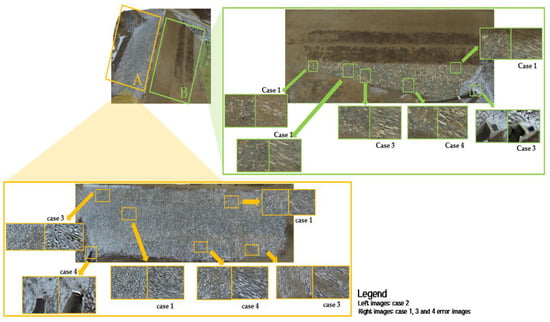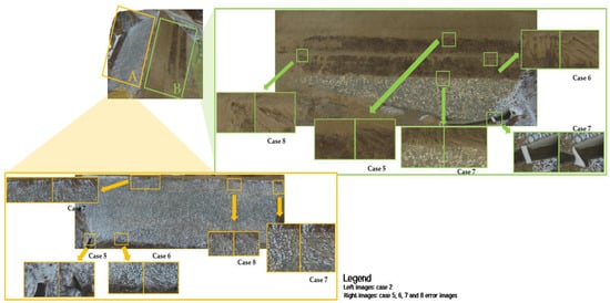 The 3D model visual inspection evaluation of the earthwork study site was divided into A and B sides, as shown in Figure 7 and Figure 8 (A side yellow, B side green). In the enlarged Figure 7 of sides A and B, the picture on the left is for case 2, and the picture on the right is for cases 1, 3, and 4. In the latter three cases, the images were distorted or bent compared with case 2. In case 2, the 3D model was performed neatly without errors such as distortion or warping of the surface. In the enlarged Figure 8 of sides A and B, the picture on the left was case 2, and the picture on the right is for cases 5, 6, 7, and 8. In the latter four cases, the images were distorted or warped more than in case 2. Case 6, which had a UAV shooting height of 100 m, had fewer errors (such as distortion or bending) than cases 5, 7, and 8. However, due to the height difference, a cleaner result was not obtained than in case 2. A visual inspection verified that case 2 had a superior 3D model performance compared to the other cases. Case 2 was the most accurate in both quantitative and visual inspection evaluations.