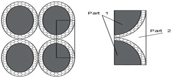 In the Feng model, particles are considered as spheres, so applying this model to particles with an elongated shape (e.g., ellipsoidal) can be considered an extension of the model. To simplify the approach, the particles are considered to be ellipsoidal. According to the method described by Feng [23], it is possible to obtain a formula similar to Equation (14). If the particle cluster is considered to be arranged ellipsoidal, as shown in Figure A1