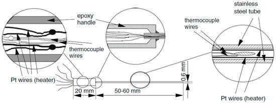 Thermal conductivity was measured using the thermal probe method. Figure 2 shows schematically the probe used to measure thermal conductivity. The probe was produced in the laboratory [27,28,29,30]. It consists of a handle (1 cm in diameter) and a stainless-steel tube (0.6 mm outer diameter and 0.3 mm inner diameter). Inside the tube is a platinum wire bent into a U-shape, which acts as a heater, and a type-K thermocouple, which acts as a temperature sensor.