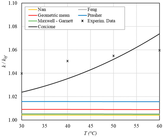 Other discrepancies in the scientific literature on thermal conductivity behavior can be attributed to particle size [8,9,15,16]. Indeed, some analytical models, such as that of Nan and Feng, lead to opposite predictions of thermal conductivity. Moreover, some experimental studies [8,15] show a proportional trend of thermal conductivity as a function of particle size, while other studies [9,16] show an opposite trend for the same nanofluids.