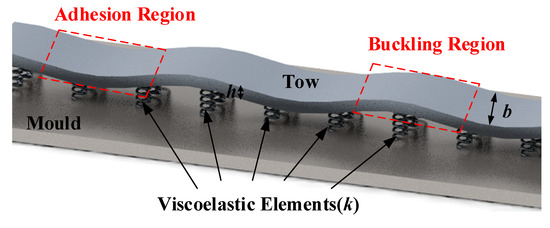 It is known that the deflection is much larger than the thickness of the tow, and the curvature of the trajectory is relatively small. Therefore, the buckling tow is equivalent to a rectangular orthotropic homogeneous flexible thin plate, and the buckling equation is established by the large deflection bending theory of the thin plate. The uniformly distributed elastic elements are used to characterize the inhibition effect of the adhesion between the tow and the mold on the formation of wrinkles (Figure 1); that is, the adhesive layer composed of spring elements is inserted, and its elastic coefficient represents the adhesion force of the tow, which is directly affected by process parameters.