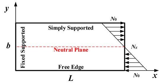 Since the established buckling model is a rectangular thin plate structure with fixed support on opposite sides and a simple support on one side, the Navier method [13] and Levy method [14] based on Fourier trigonometric function series cannot meet the boundary conditions. In this paper, a deflection function based on the deformation form of the double cosine series is proposed: