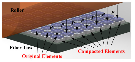 It can be seen from Equation (8) that there are many factors affecting the buckling state of the inner side. In addition to the material properties (width, thickness and Young’s modulus of the tow), the in-plane compression load and the adhesion coefficient between the tow and the mold play an important role. Therefore, in this paper, intimate contact is used to characterize the adhesion coefficient, and the rough surface of the prepreg tow is equivalent to a rectangular element array with equal spacing distribution (Figure 3). The fluid continuity equation is used to calculate the geometric size change of rectangular elements before and after compaction, which is the evaluation index for the bonding effect of the layers [20,21,22].