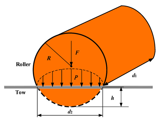 The contact model between the flexible roller and the prepreg tow can be divided into the contact along the tow length direction and the contact along the tow width direction [23]. Since the roller continuously compacts the tow on the mold surface along the laying direction, the compaction effect on each position of the tow is consistent; that is, the tow is laid under the maximum pressure. If the width of the tow is narrow, there is almost no difference in the pressure along the width of the tow. Consequently, the lateral and longitudinal distribution of the pressure have no impact on laying quality. The compaction model established in this paper is mainly to solve the maximum compaction pressure and the width of the contact region, so as to obtain the degree of intimate contact.