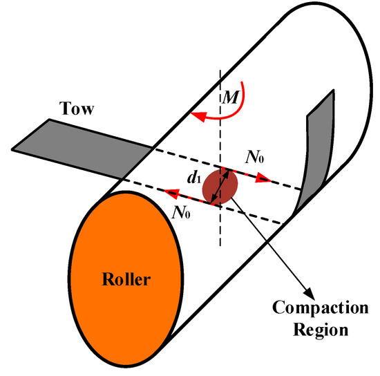 According to the friction contact theory, the tangential contact model between the roller and the tow is established (Figure 5), as well as the functional relationship between the total rotating torque of the placement head and the in-plane load. The width of the tow is small and close to the width of the compaction region. The tangential contact region can be approximated as a circular contact model, and the diameter is the width of the tow. In Figure 5, is the torque applied to the roller, and is the in-plane compression and tensile load. In order to simplify the model, the relative sliding between the roller and the tow is not considered in this paper.