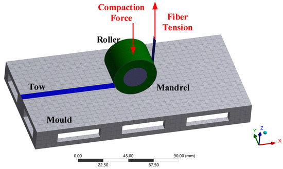 The compaction force is generated by the robot end effector and applied to the mandrel of the roller, which then acts on the surface of the prepreg tow through the roller. Therefore, the compaction force applied to the rigid mandrel in the simulation model is closer to the actual situation. A small tensile force is applied to the upper section of the tow to simulate the tow tension and avoid the lateral slip of the tow. The established compaction simulation model is shown in Figure 6.