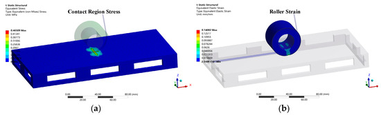 Nephogram of finite element simulation results: (a) Simulation results of contact stress; (b) Simulation results of roller strain.