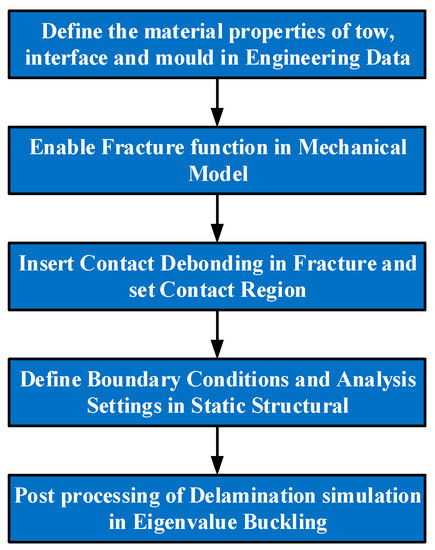 Considering that the wrinkle area is unknown, it is impossible to set the preformed crack, so CZM is utilized to simulate the delamination. In order to simplify the simulation model, contact debonding is used to establish the contact pair between the tow and the mold, and different adhesion coefficients are characterized by setting the material properties of the cohesive zone (maximum normal contact stress and delamination gap) in the ACP pretreatment module. The Figure 8 shows the detailed modeling process.